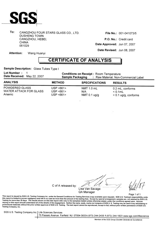 ISO國際標準,玻璃管顆粒法耐水I級為耗酸量小于1ML,國際同行業(yè)的數值是0.35ML,而我們是0.2ML(數值越小質量越好),此項技術已經獲得了美國權威檢測機構SGS的檢測證書,此產品已經達到國際先進水平。