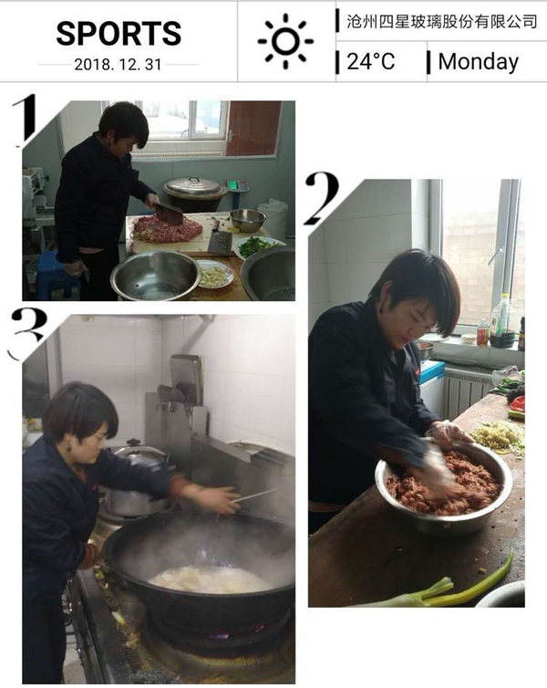 大家伙共同布置我們的會場,貼福字,掛條幅,換桌布,有些同事自己從家里拿案板與廚具。四星也是我們的家。