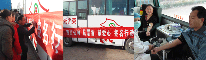 于2010年11月,河北省遭遇60年罕見的暴風(fēng)雪,相關(guān)地區(qū)受災(zāi)嚴(yán)重,一方群眾急需血液,但血庫供血告急,當(dāng)公司接到上級政府救援通知后,及時動員全體職工無償獻血,奉獻愛心活動。
