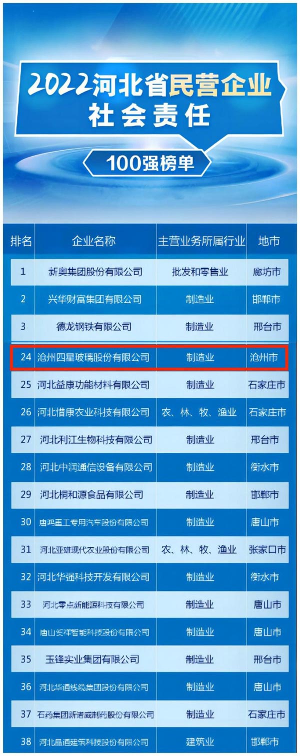 | 滄州四星玻璃入選2022年“河北省民營企業(yè)社會責(zé)任100強”榜單 |